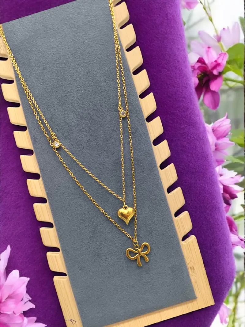 The shorter strand holds a polished, puffed heart pendant, while the longer strand showcases a delicate ribbon bow.