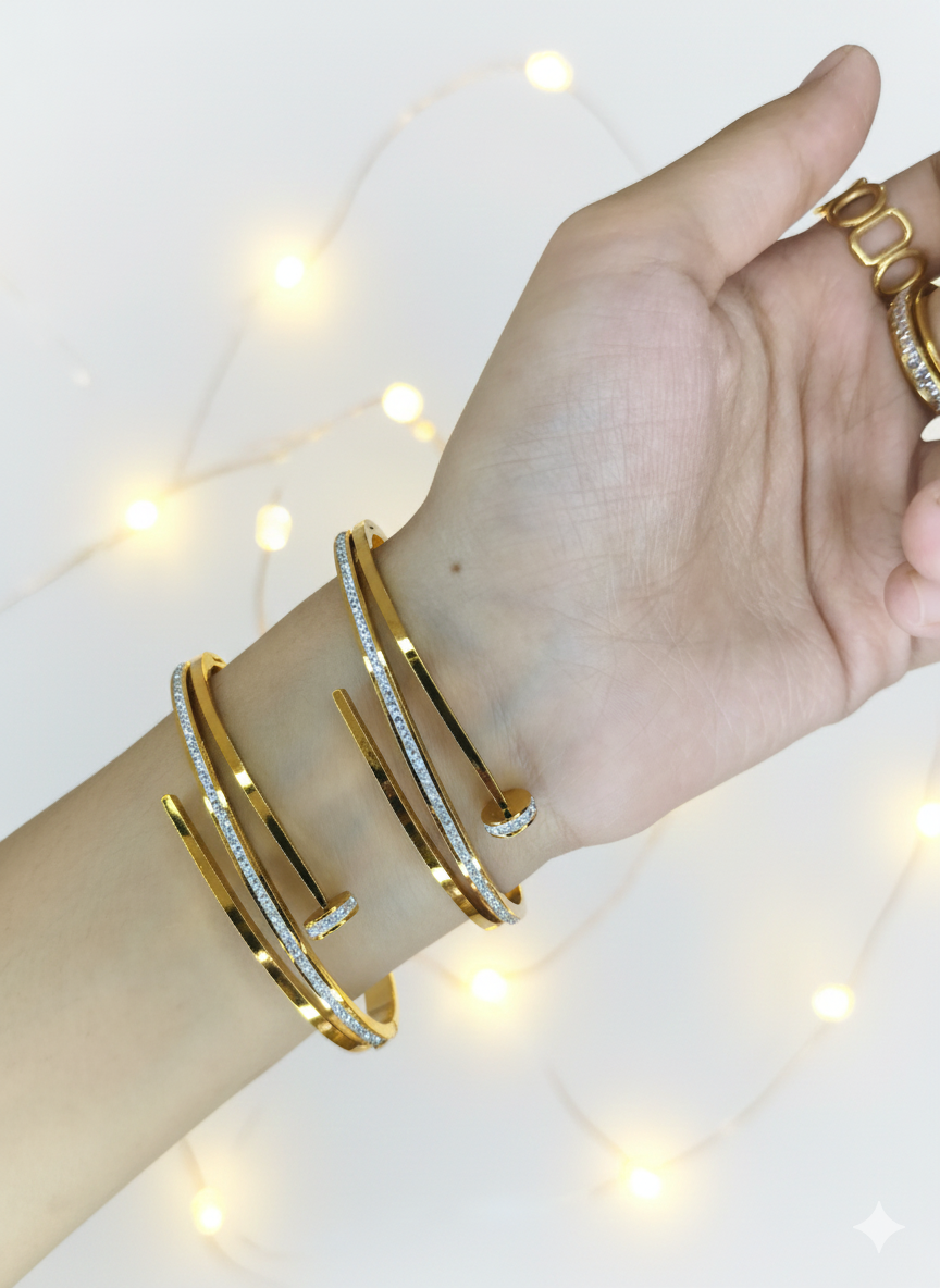This sleek, gold-toned piece combines the traditional structure of a kada with the contemporary flair of a nail-style bangle. Adorned with shimmering accents, it’s a versatile addition to any jewellery collection.